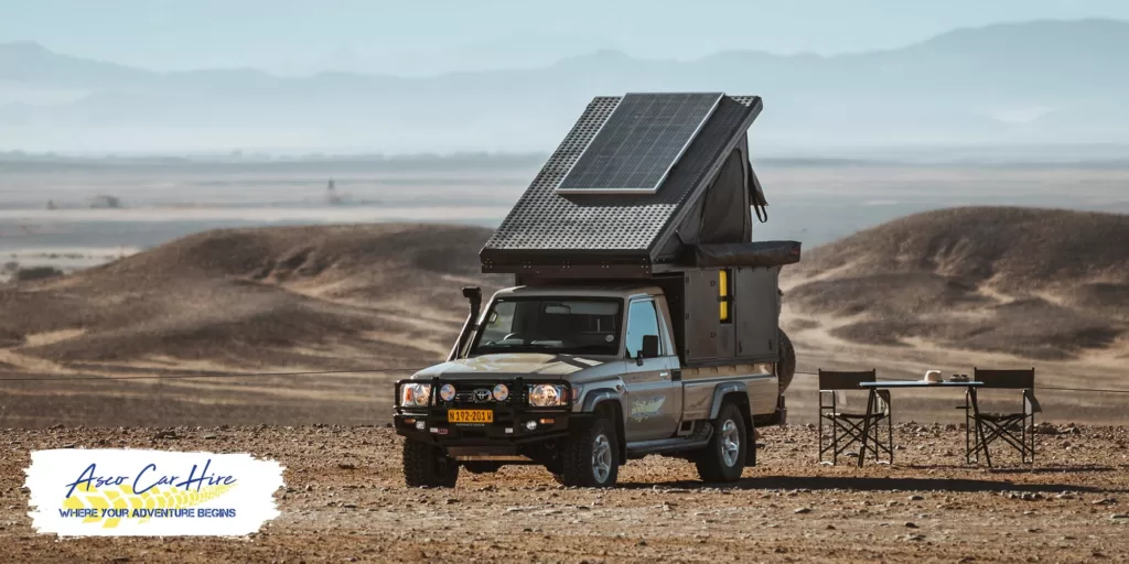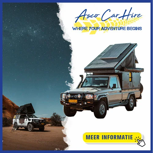 Goede verhuurbedrijven in Namibië zoals Asco Car Hire bieden goed onderhouden 4×4 voertuigen aan die helemaal zijn aangepast voor het offroad rijden in Namibië en bieden naast bovenstaande o.a. ook een dubbel accu systeem, ingebouwde watertank en indien gewenst een complete kampeeruitrusting inclusief daktenten. Een GPS-systeem kun je desgewenst voor slechts € 6 per dag (inclusief Tracks4Africa kaarten) bij de 4×4 auto erbij huren.